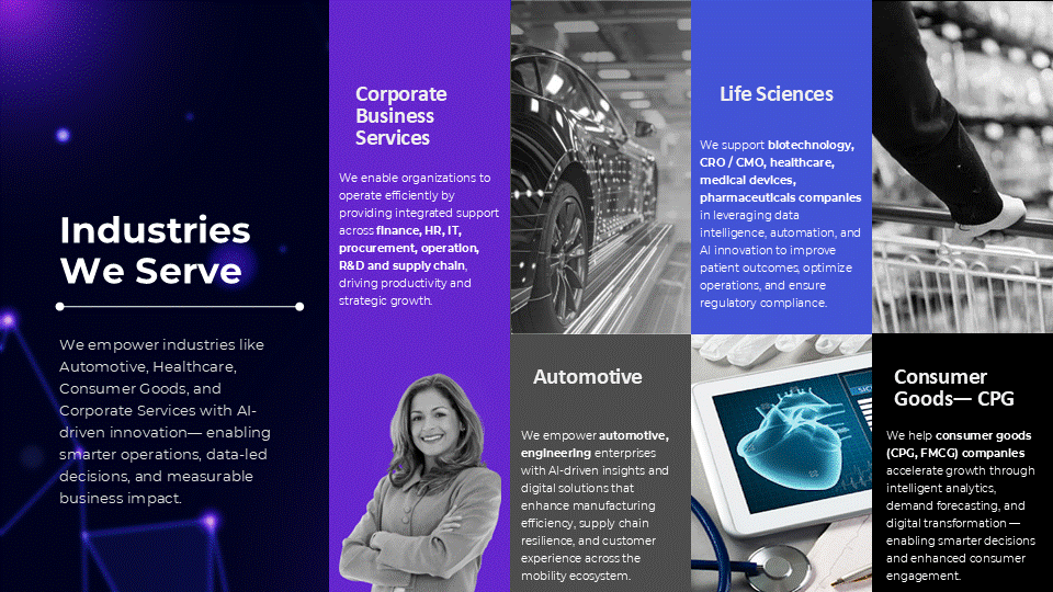 Corporate Services (Finance, HR, IT, Procurement, Manufacturing, R&D, Supply-Chain), Automotive, Life Science (Biotech, Healthcare, MedTech, Pharmaceuticals) and Consumer Goods (CPG, FMCG, F&B, Fashion).
